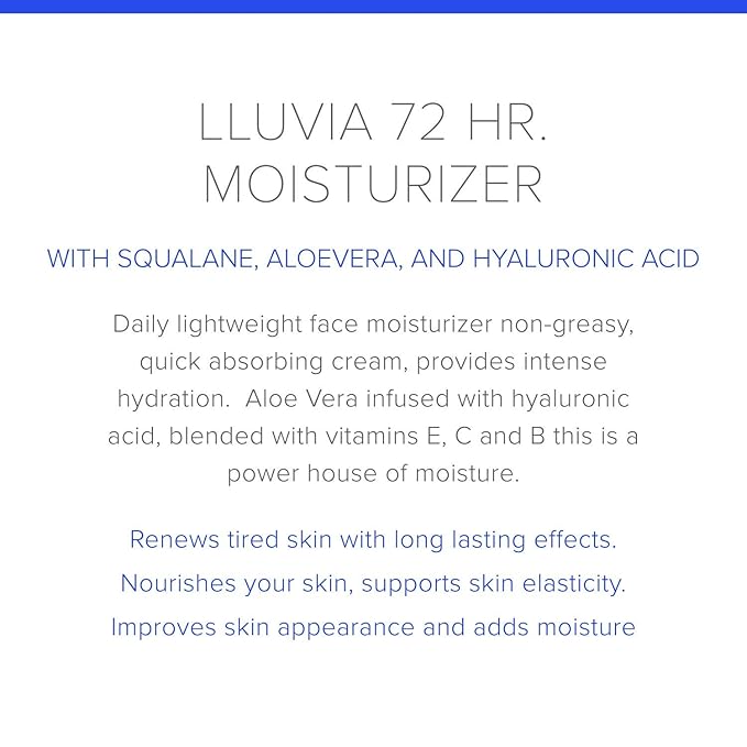 - Lluvia 72- Hour Moisturizer- Our Lluvia 72-hour moisturizer is formulated with Aloe-infused water and Hyaluronic Acid, blended with Vitamins E, C, and B, to create a powerful complex that locks in moisture. The results are powerful, providing long-lasting hydration for quenched and smooth skin. Beneficial for all skin types.