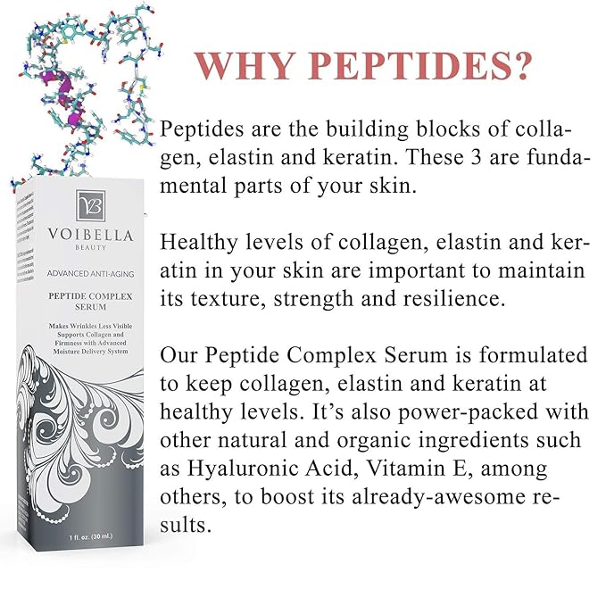 - Peptide Complex Serum: Natural Collagen Support Peptide Serum - Proven formula with Organic Peptides, Hyaluronic Acid, Amino Acids, Vitamin E and Aloe Vera provides collagen support to give you a tighter, firmer, smoother, plump and more beautiful skin.