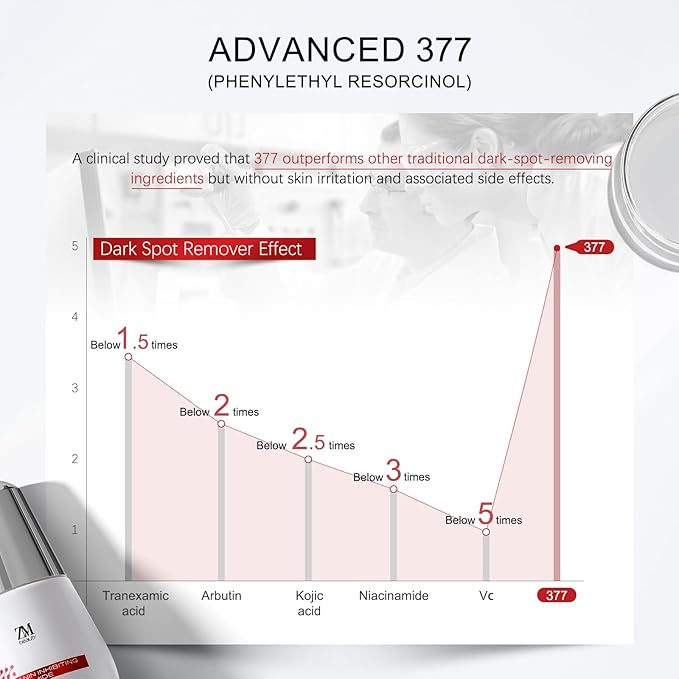 - 377 (Phenylethyl Resorcinol): After testing, 377 proves to be more effective than traditional dark spot corrector treatments, such as Tranexamic Acid, Arbutin, etc. By inhibiting the activity of tyrosinaseâessential for melanin productionâ1% 377 effectively reduces melanin levels. It combats dullness, old acne marks, and dark spots, leaving your skin looking radiant and revitalized.