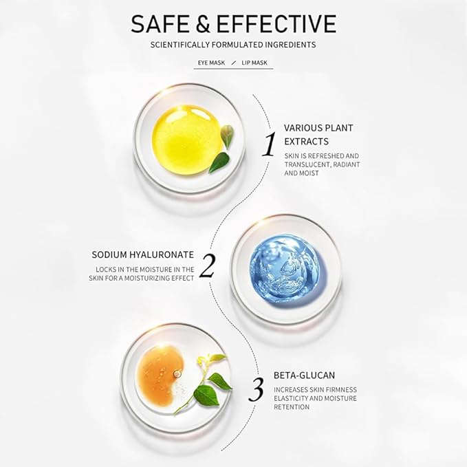 - This Under eye mask and lip patche set, rich of Collagen, Hyaluronic acid, Glycerin, Vitamin C, Vitamin E. Keeping your lips and eyes skin moisturized, soft, fresh and elastic.