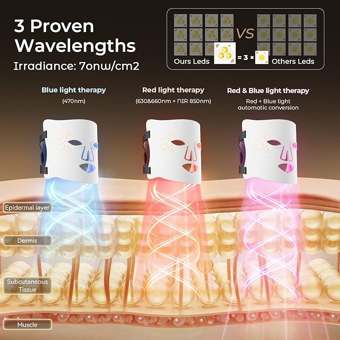 - 【3 Gears Red Light Therapy for Face】Red light (630nm) + Near-infrared light (830nm),3 gears.The combination of red light and near-infrared light which is the best combination to increase skin elasticity and gloss.Red light can help balance oil secretion.Red light helps improve skin redness.The irradiance of the product is 70nw/cm2.Experience the transformative effects of our red light therapy mask, designed to achieve rejuvenated, glowing skin.
